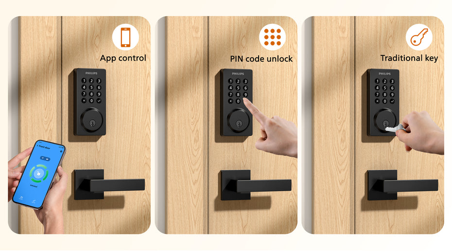 3 ways to unlock your door with ease: Choose the unlock method that fits your lifestyle the moment you arrive home. You can choose from unlocking with PIN codes, keys, or just unlock the door with a gentle touch of the Philips Home Access app on your smartphone.