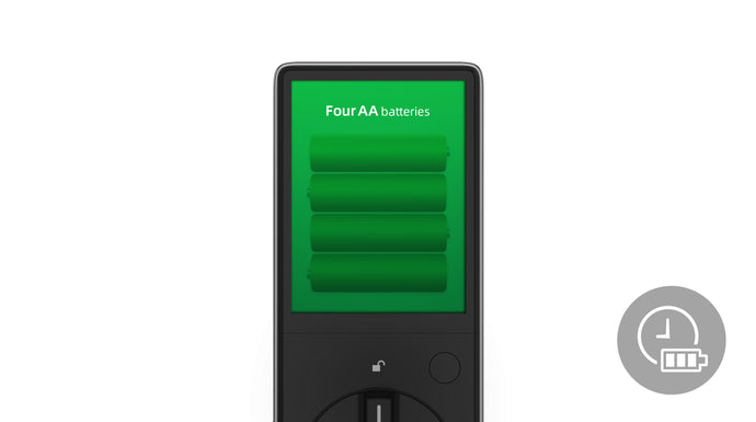 The lock is powered by 4 AA alkaline batteries, with a maximum lifespan of up to 12 months. Actual battery life may vary depending on usage and environmental conditions. A low battery indicator on the lock will notify you when replacement is needed.